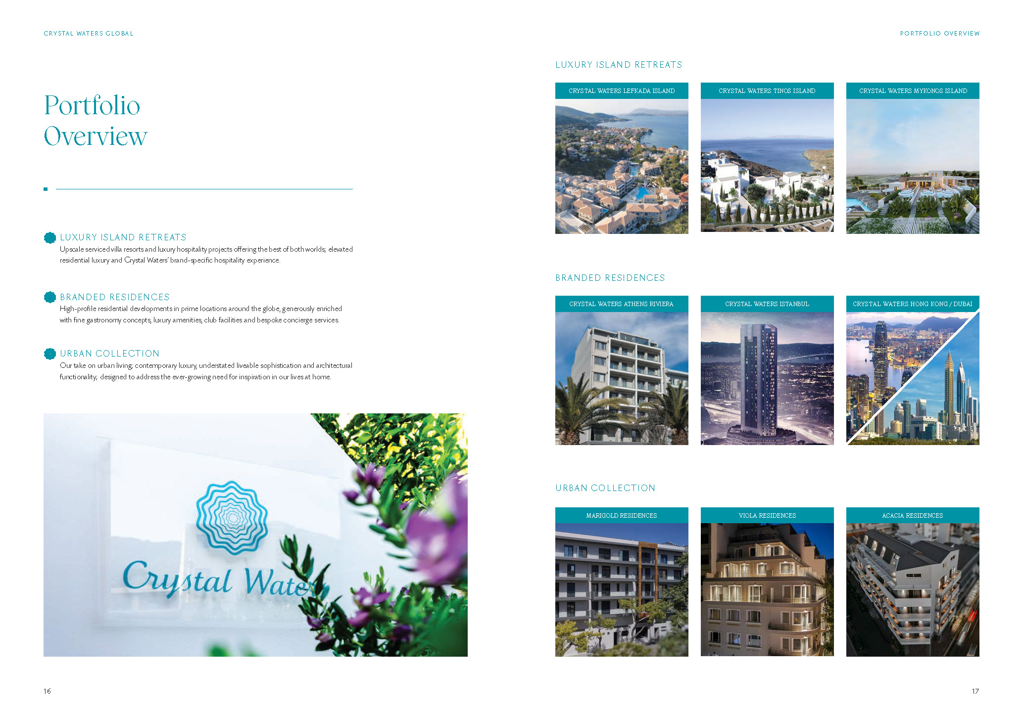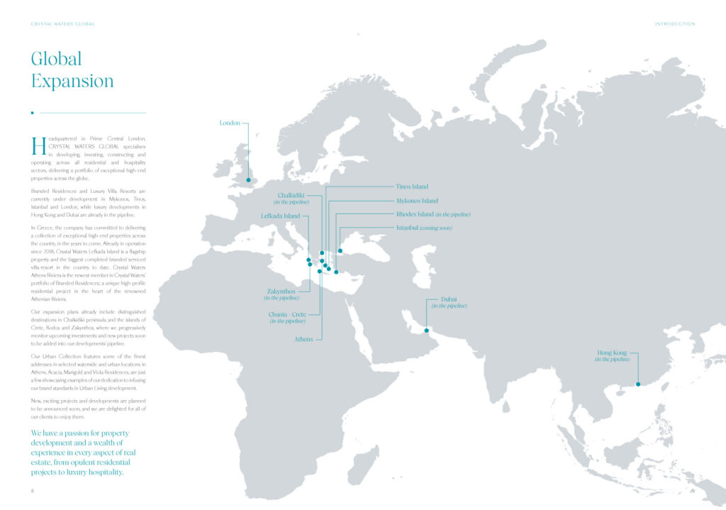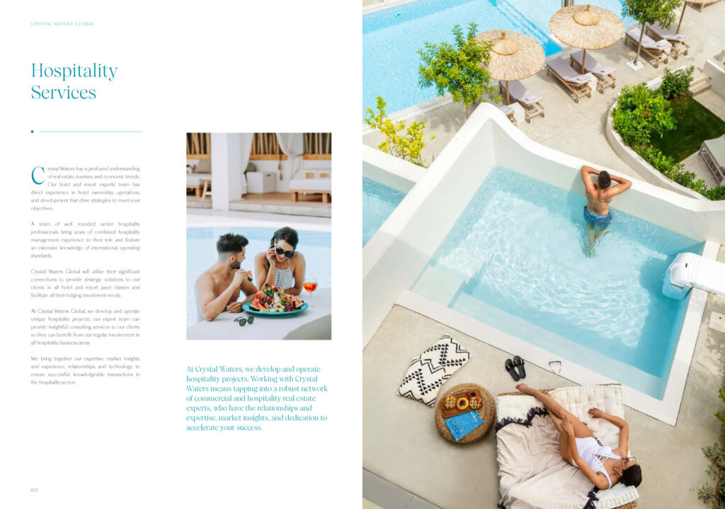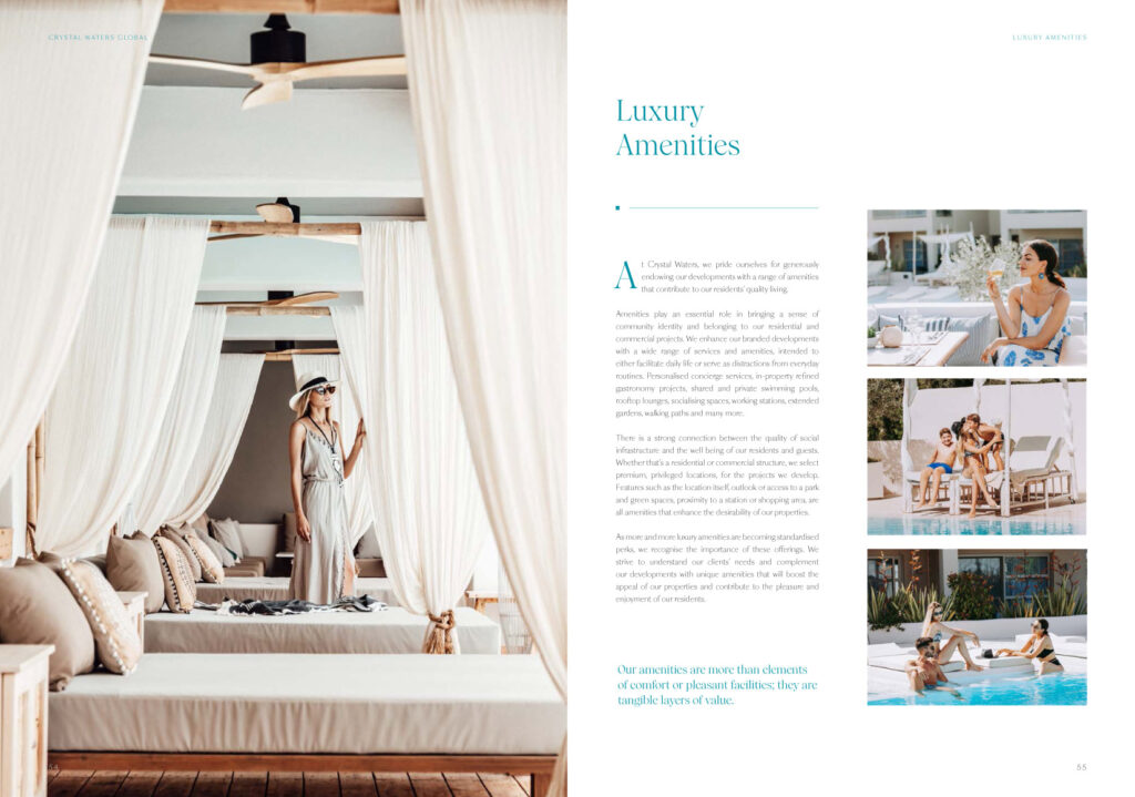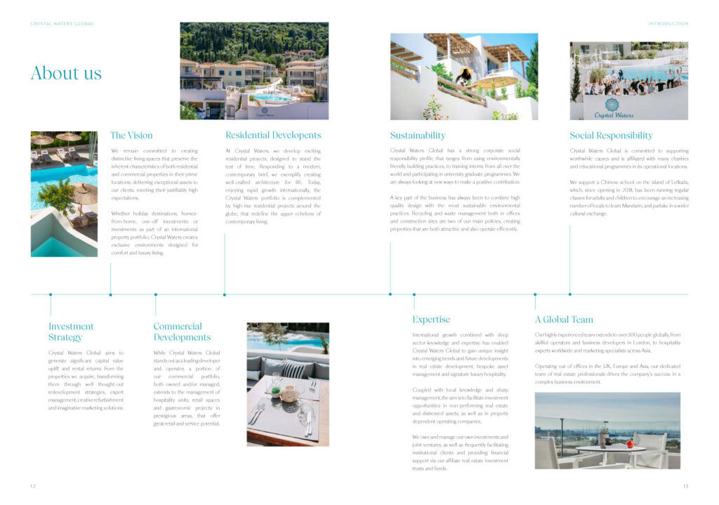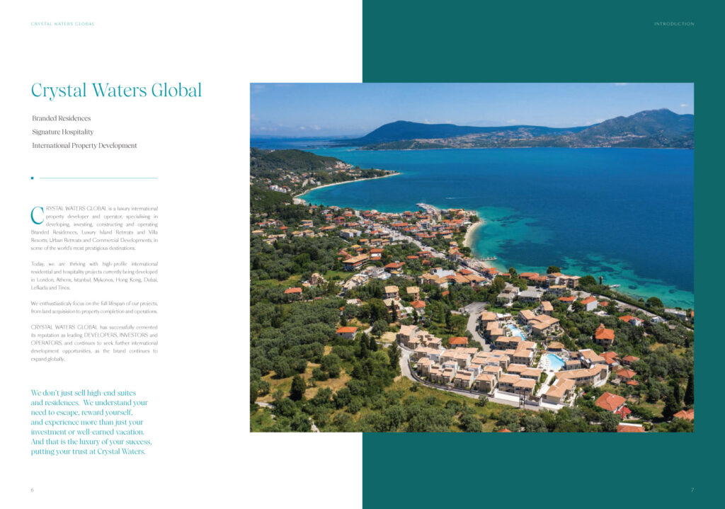 Σχεδιασμός Μπροσούρας για την εταιρία Crystal Waters που δραστηριοποιείται στο τομέα του Real Estate & Hospitality. 80 Σελίδες.