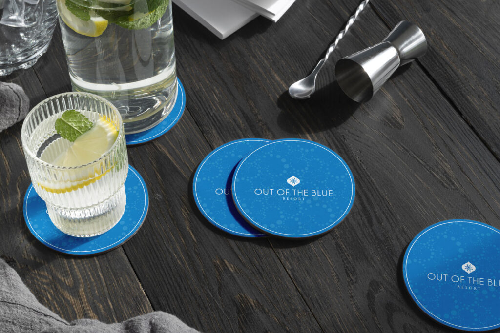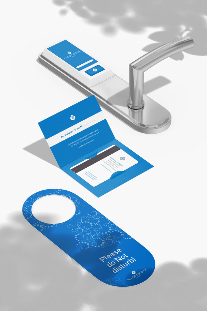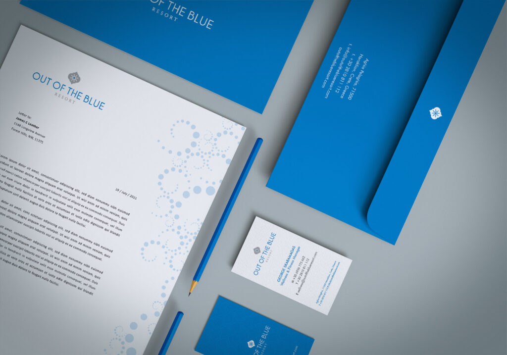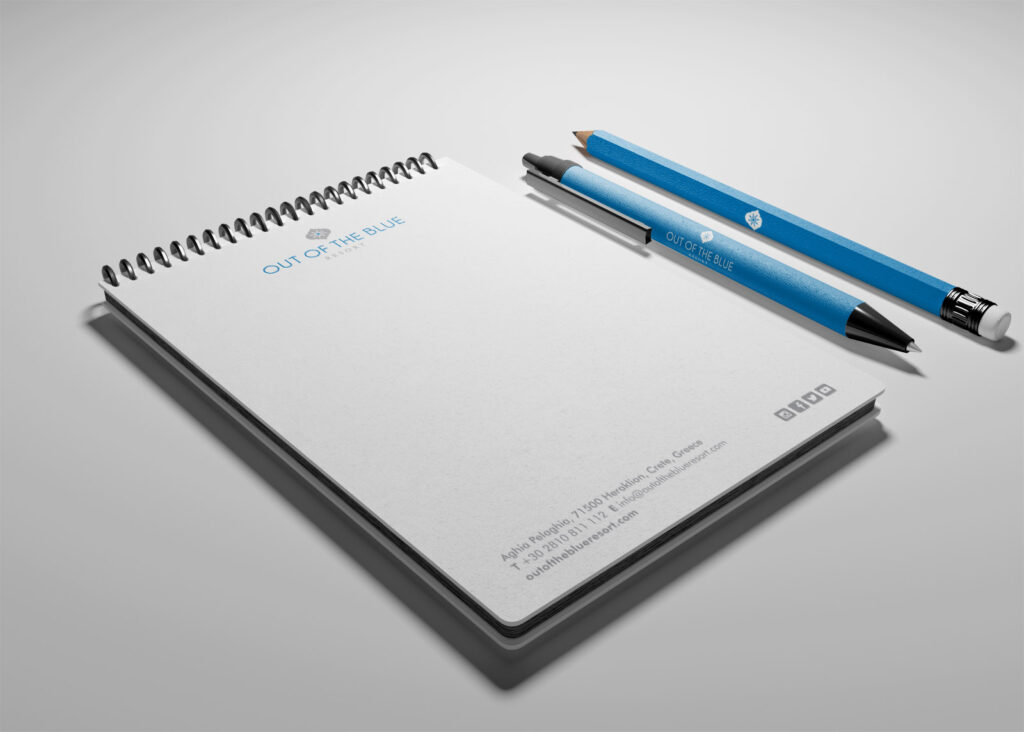 Re-Branding, σχεδιασμός λογοτύπου και εταιρικής ταυτότητας του ξενοδοχείο Out of the Blue Resort στην Αγ. Πελαγία του Ηράκλειο. Σχεδιασμός όλων των έντυπων & ηλεκτρονικών εφαρμογών της εσωτερικης λειτουργίας και του operation του ξενοδοχείου. Καρτελάκια δωματίων, έντυπα Reception και εσωτερικής λειτουργίας, εταιρική ταυτότητα, φόρμες, μενού, σημάνσεις, έντυπα πελατών κτλπ.